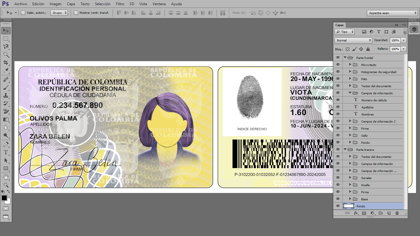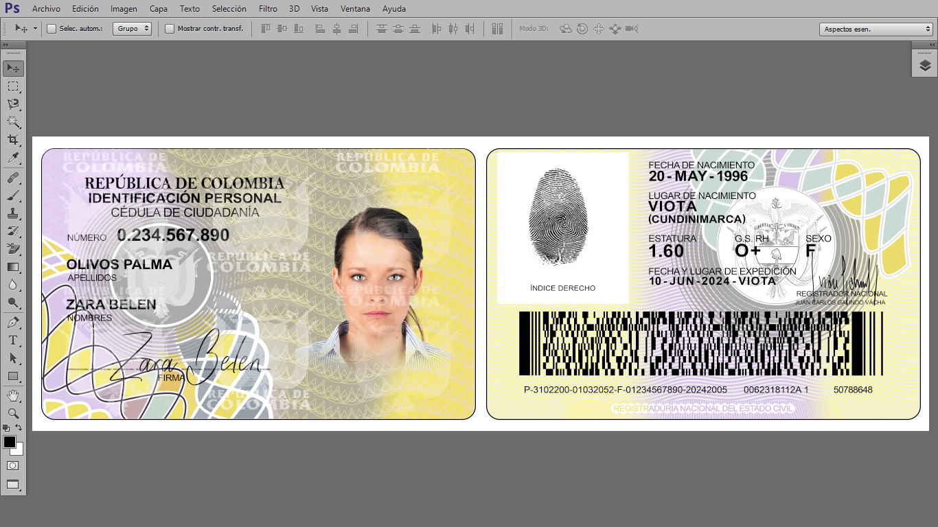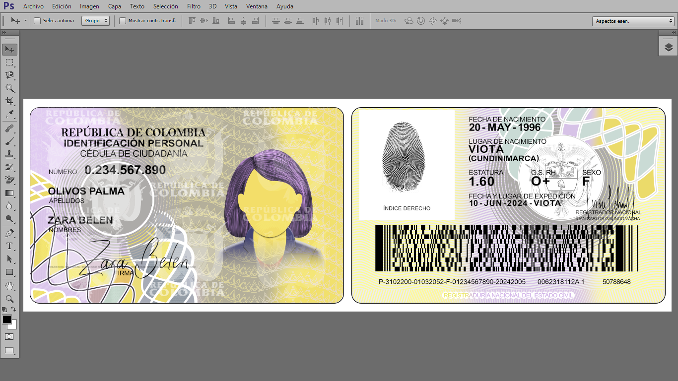 Plantilla PSD editable, para crear duplicados ilustrativos de Cédulas de Colombia, para actividades On-Line, crear cuentas de diversas plataformas Urber, In-Drive, Didi o verificar usuarios de plataformas que piden enviar foto de dicho documento