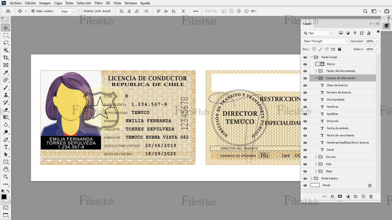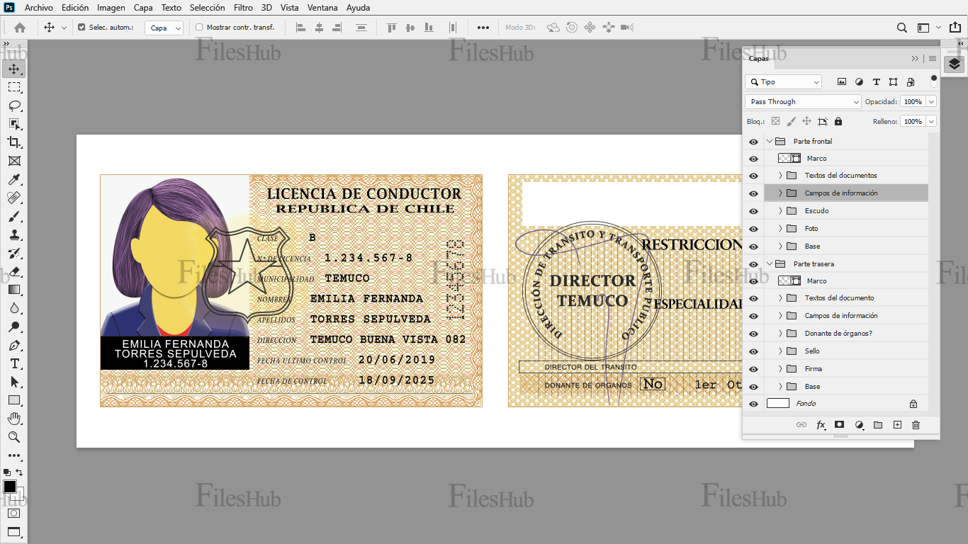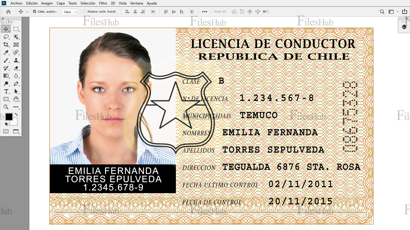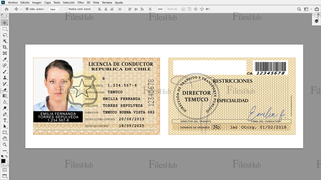 Plantilla PSD editable, para crear duplicados ilustrativos de licencias de conducir de Chile, para actividades On-Line, crear cuentas de diversas plataformas Urber, In-Drive, Didi o verificar usuarios de plataformas que piden enviar foto de dicho documento