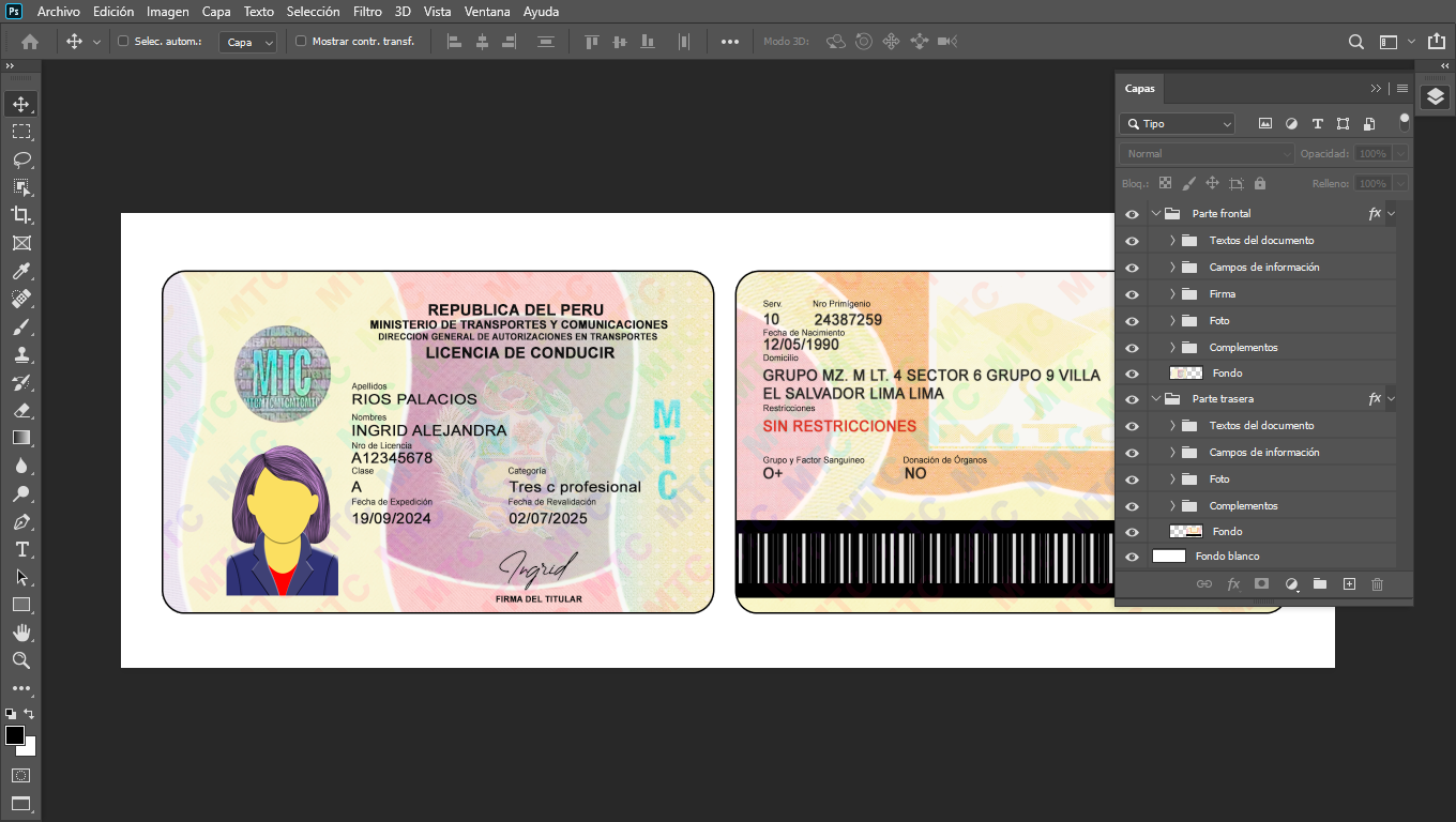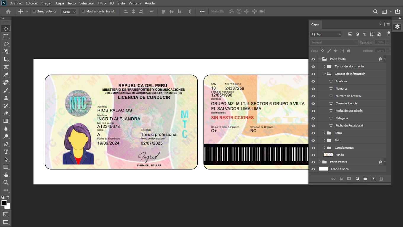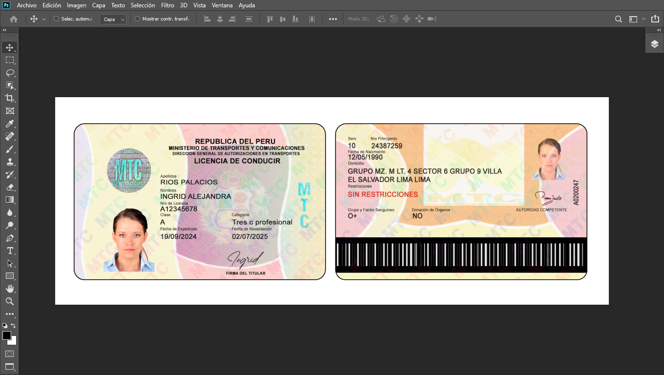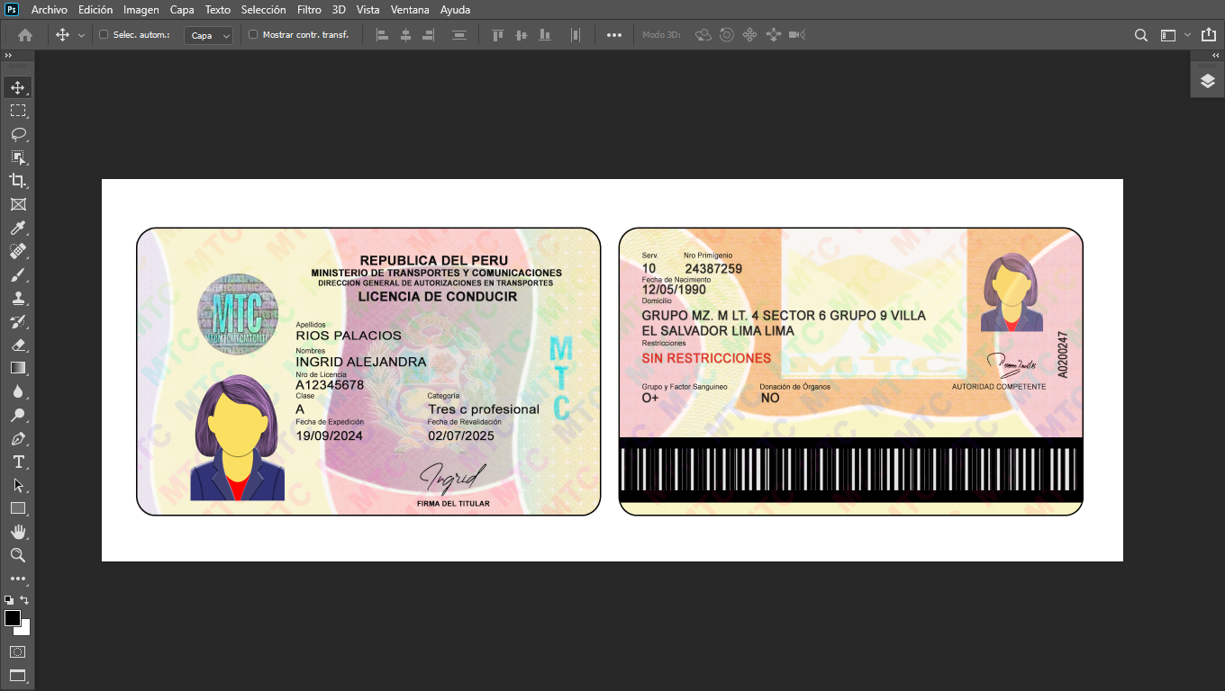 Plantilla PSD editable, para crear duplicados ilustrativos de licencias de conducir de Perú, para actividades On-Line, crear cuentas de diversas plataformas Urber, In-Drive, Didi o verificar usuarios de plataformas que piden enviar foto de dicho documento