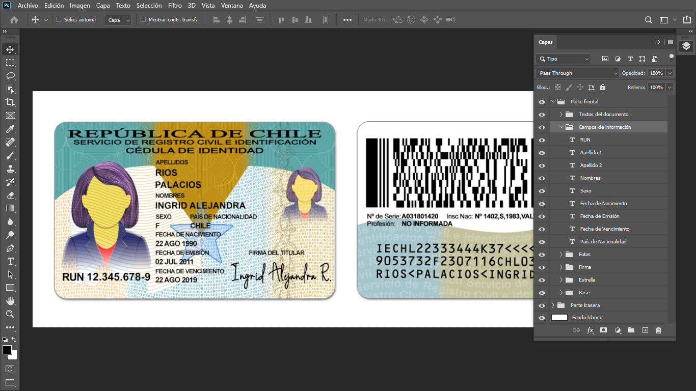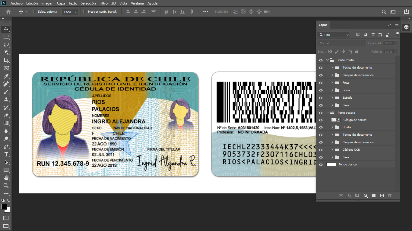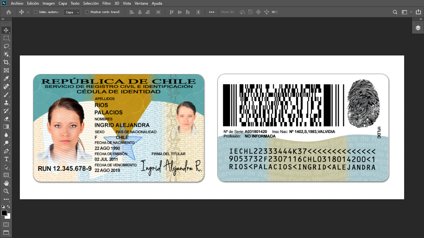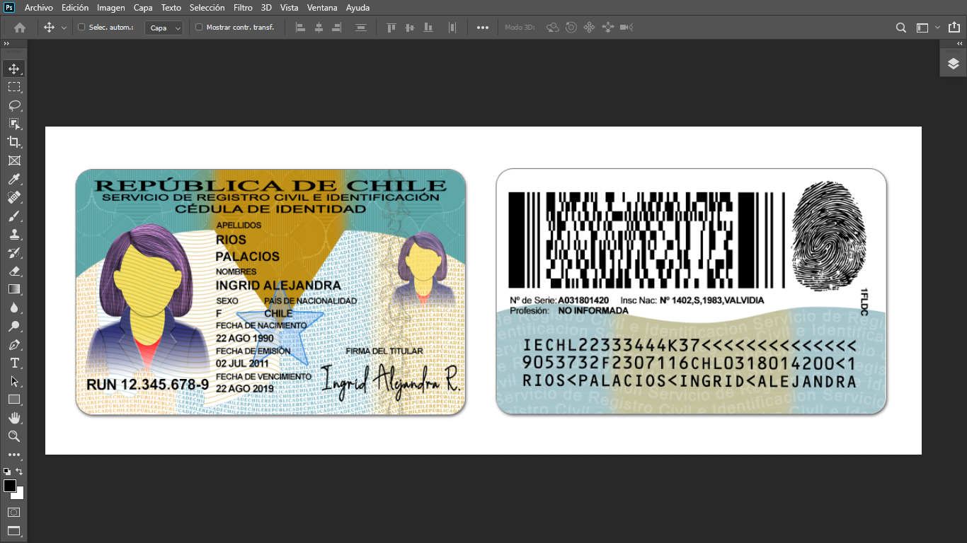 Plantilla PSD editable, para crear duplicados ilustrativos de cédulas de identidad de Chile, para actividades On-Line, crear cuentas de diversas plataformas Urber, In-Drive, Didi o verificar usuarios de plataformas que piden enviar foto de dicho documento